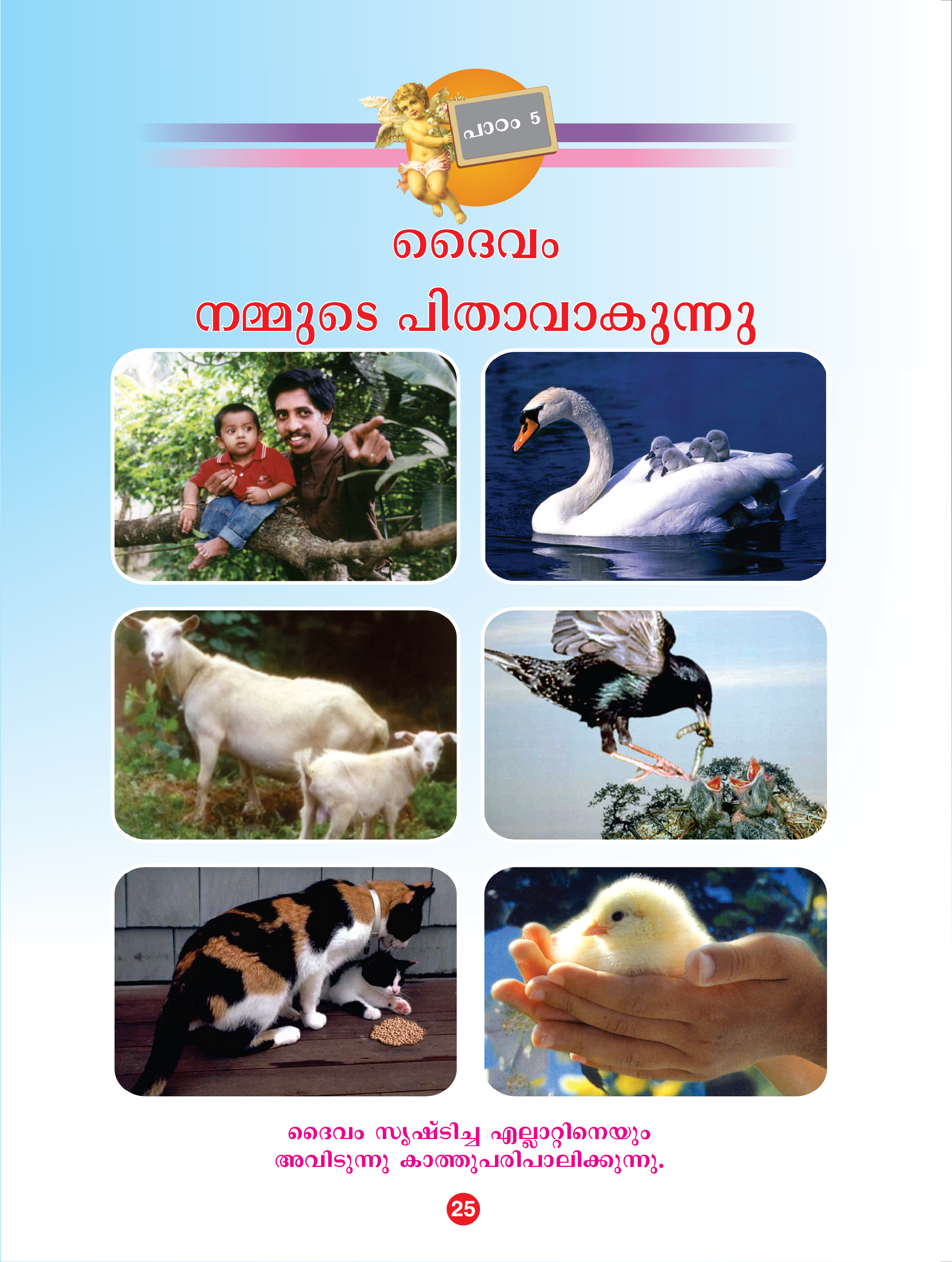 പിതാവ് എന്ന സങ്കല്പം കുട്ടിക്ക് പരിചിതമാണ്. പിതാവ് ജോലി ചെയ്യുന്നതും തന്റെ കുടുംബത്തെ സംരക്ഷിക്കുന്നതുമെല്ലാം പ്രാരംഭചര്ച്ചയില് ഉള്പ്പെടുത്താവുന്നതാണ്. പേജ് 17 ലെ ചിത്രങ്ങളിലൂടെ കടന്നുപോയി 'സംരക്ഷണം' എന്ന ആശയത്തിന്റെ വിശാലതലങ്ങള്, കുട്ടിക്ക് വ്യക്തമാക്കി കൊടുക്കാം. അതിലൂടെ തന്റെ സൃഷ്ടികള്ക്കെല്ലാം ആഹാരവും സംരക്ഷണവും നല്കി ദൈവം കാത്തുപരിപാലിക്കുന്നു എന്ന ബോധ്യം കുട്ടിക്ക് ലഭ്യമാകും. ദൈവത്തിന്റെ കരങ്ങളിലാണ് താന് എന്ന അനുഭവം കിട്ടണം. ഏത് ആപത്തിലും സഹായിക്കുവാനും സംരക്ഷിക്കുവാനും ദൈവം കാവല്മാലാഖയെ തന്നിരിക്കുന്നു.