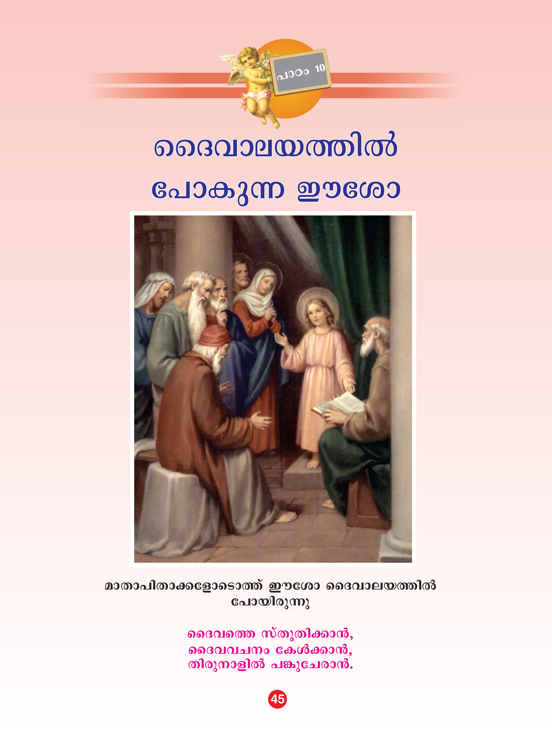 മാതാപിതാക്കളോടൊത്ത് ഈശോ ദൈവാലയത്തില് പോയിരുന്നുദൈവത്തെ സ്തുതിക്കാന്,ദൈവവചനം കേള്ക്കാന്,തിരുനാളില് പങ്കുചേരാന്.