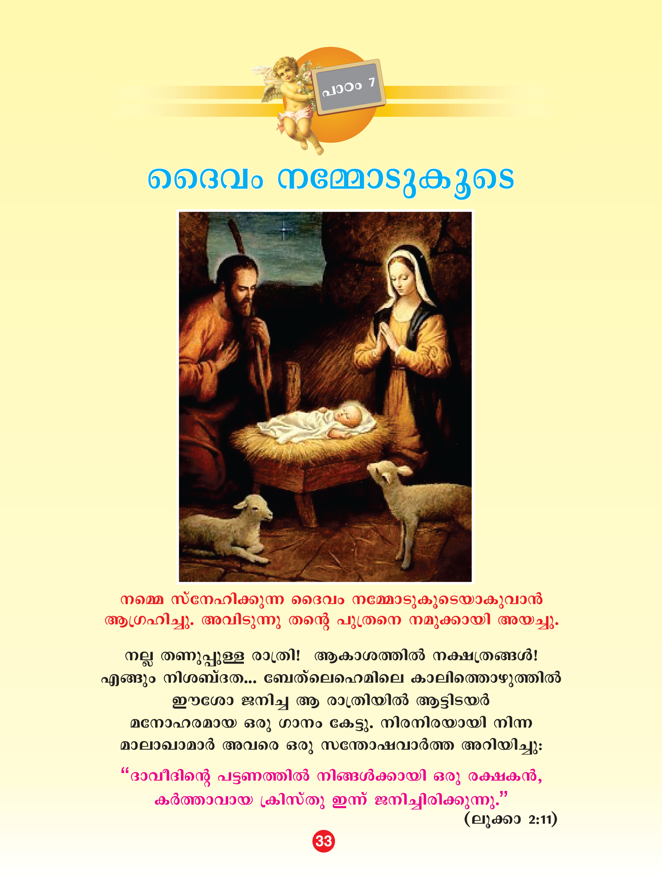 നമ്മെ സ്നേഹിക്കുന്ന ദൈവം നമ്മോടുകൂടൊയാകുവാന് ആഗ്രഹിച്ചു. അവിടുന്നു തന്റെ പുത്രനെ നമുക്കായി അയച്ചു. നല്ല തണുപ്പുള്ള രാത്രി! ആകാശത്തില് നക്ഷത്രങ്ങള്! എങ്ങും നിശബ്ദത... ബേത്ലെഹെമിലെ കാലിത്തൊഴുത്തില് ഈശോ ജനിച്ച ആ രാത്രിയില് ആട്ടിടയര് മനോഹരമായ ഒരു ഗാനം കേട്ടു. നിരനിരയായി നിന്ന മാലാഖാമാര് അവരെ ഒരു സന്തോഷവാര്ത്ത അറിയിച്ചു:ദാവീദിന്റെ പട്ടണത്തില് നിങ്ങള്ക്കായി ഒരു രക്ഷകന് കര്ത്താവായ ക്രിസ്തു ഇന്ന് ജനിച്ചിരിക്കുന്നു.ലൂക്കാ 2:11 മനുഷ്യനായി ജനിച്ച ദൈവപുത്രനാണ് ഈശോ അങ്ങനെ ദൈവം നമ്മോടുകൂടെയായി.