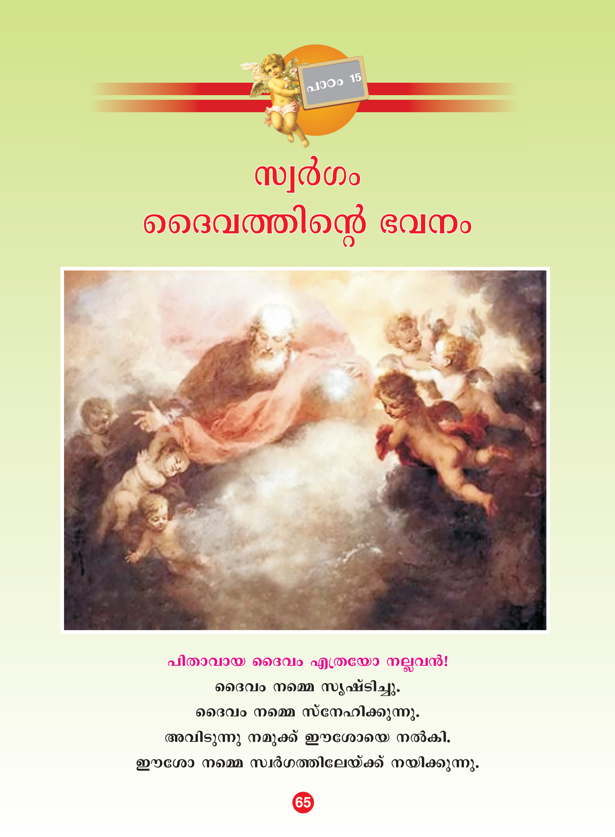 സ്വര്ഗം നമ്മുടെ സ്വന്തം ഭവനംമാലാഖാമാര് വാഴും ഭവനംസ്വര്ഗപിതാവിന് സ്വന്തം ഭവനംമാനവരെല്ലാം തേടും ഭവനം.പേരെഴുതാംസ്വര്ഗത്തില് ദൈവത്തോടൊപ്പം വസിക്കുന്നത്വിശുദ്ധരും മാലാഖാമാരുമാണ്. നിങ്ങള്ക്കറിയാവുന്ന ഏതാനുംവിശുദ്ധരുടെയും മാലാഖമാരുടേയും പേരുകള് എഴുതാമോ?മഹത്വപൂര്ണമായ സ്വര്ഗം