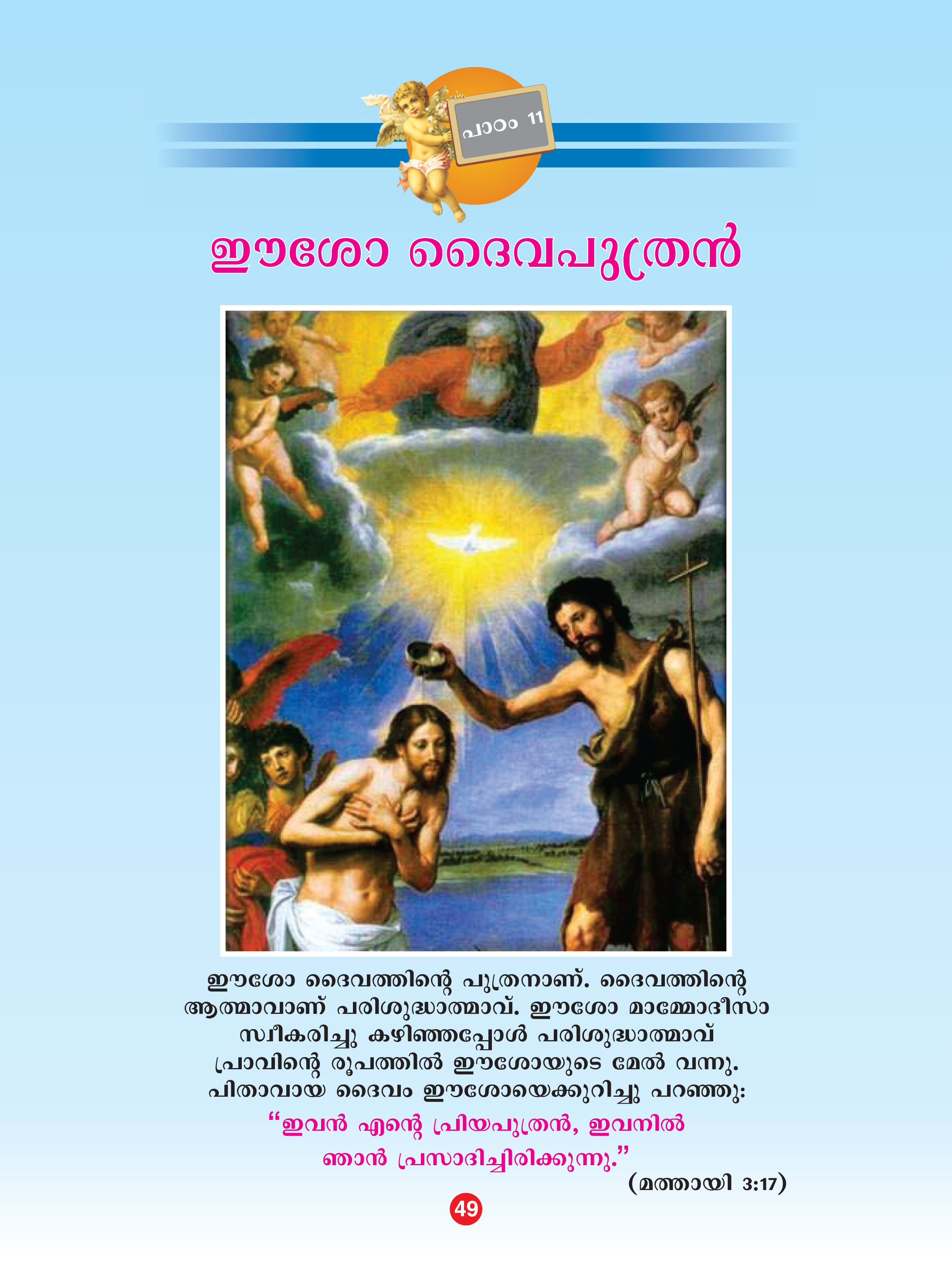 ഈശോ ദൈവത്തിന്റെ പുത്രനാണ്. ദൈവത്തിന്റെ ആത്മാവാണ് പരിശുദ്ധാത്മാവ്. ഈശോ മാമ്മോദീസാസ്വീകരിച്ചു കഴിഞ്ഞപ്പോള് പരിശുദ്ധാത്മാവ് പ്രാവിന്റെ രൂപത്തില് ഈശോയുടെ മേല് വന്നു. പിതാവായ ദൈവം ഈശോയെക്കുറിച്ചു പറഞ്ഞു: ഇവന് എന്റെ പ്രിയപുത്രന്, ഇവനില് ഞാന് പ്രസാദിച്ചിരിക്കുന്നു.മത്തായി 3:17